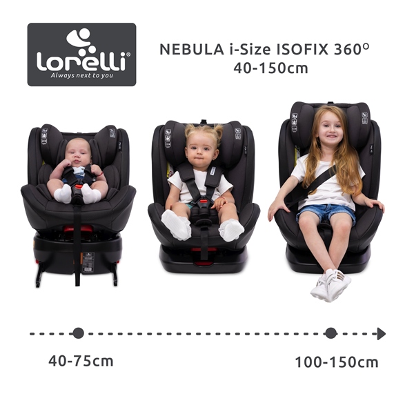 Otroški avtosedež NEBULA I-size 40-150cm Isofix – avtosedež se obrača na bazi 360° – je sodoben in funkcionalen avtosedež, ki zajema vse starostne kategorije otroka. Značilnost tega avtosedeža je tudi, da raste z otrokom. 360-stopinjsko vrtenje avtosedeža omogoča namestitev v avtu z isofix sistemom tako v smeri vožnje, kot v nasprotni smeri.